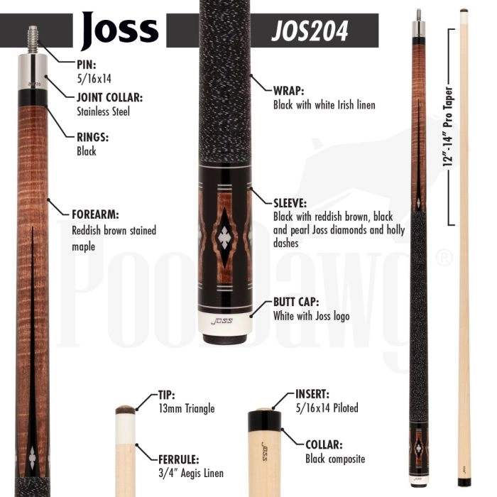 This is one classy cue. Joss Pool Cues surely makes a point of the artistry and craftsmanship they put into every single cue. This one falls right in line with the high standards at Joss. It features black and pearl Joss diamonds and holly dashes and a black with white speckles Irish linen wrap. Joss like to keep it classic by adorning their cues with 13mm LePro or Triangle tips. Of course, you can upgrade this tip from one of our may options of layered tips!