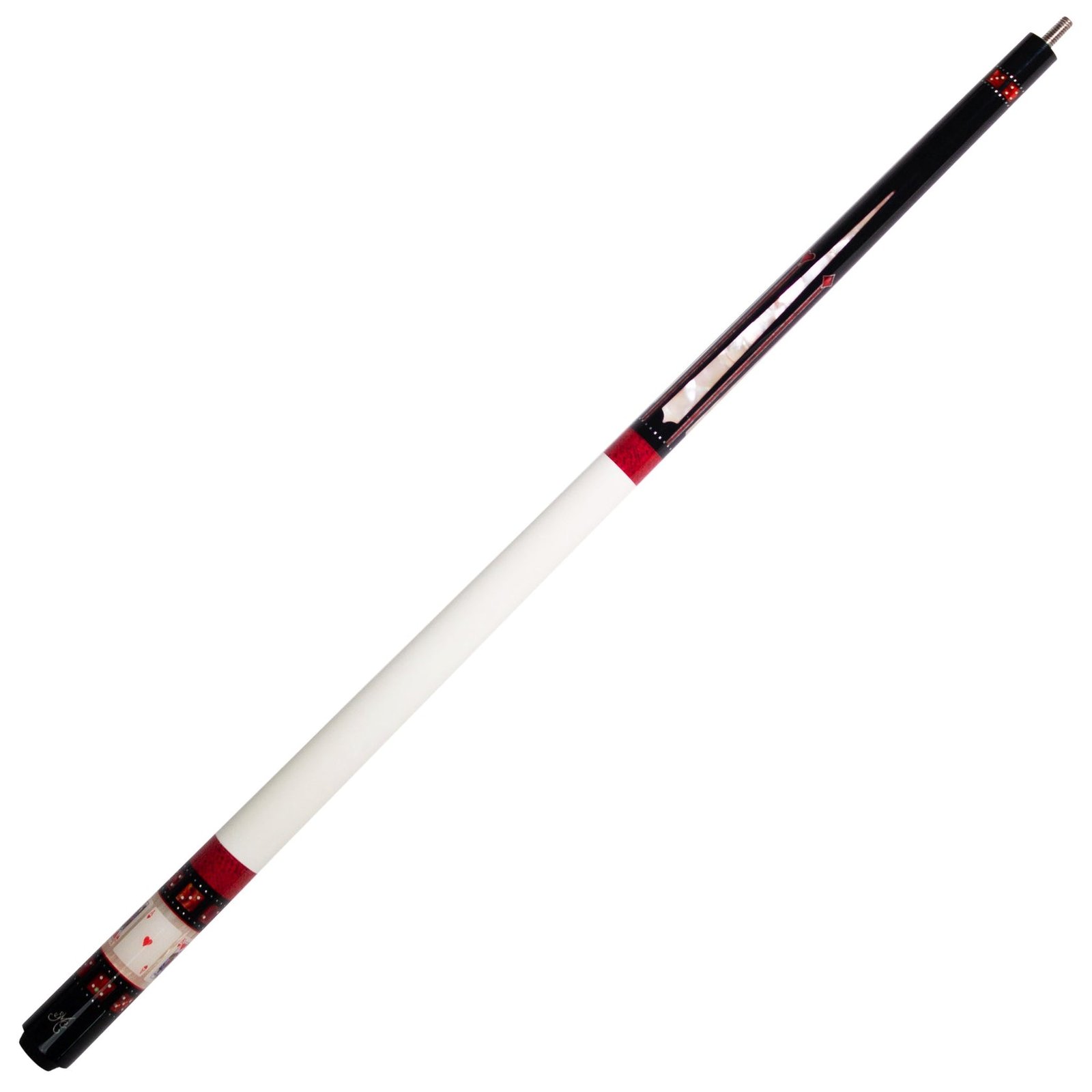 The BMC Casino 1 is a bold and eye-catching pool cue. It features an ebony-colored power piston forearm with four mother-of-pearl points, separated by four red paua shell lines. Its butt sleeve consists of a 4-card royal flush over a 48-piece Paua Shell sleeve, enhanced by red and white dice. The full design is completed by a matching shaft collar and joint.