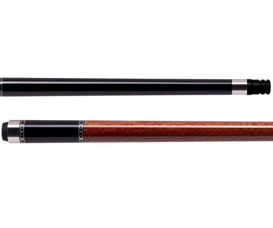 The leopard wood is the star of the show here. With a black forearm and sleeve, accented by metal rings, the highly figured wood in the handle really pops. Coated with an anti-vabration epoxy, and secured by a kiln dried maple core, this cue is built to last. With the included carbon fiber Cynergy shaft, you will be shooting as sharp as the cue looks.