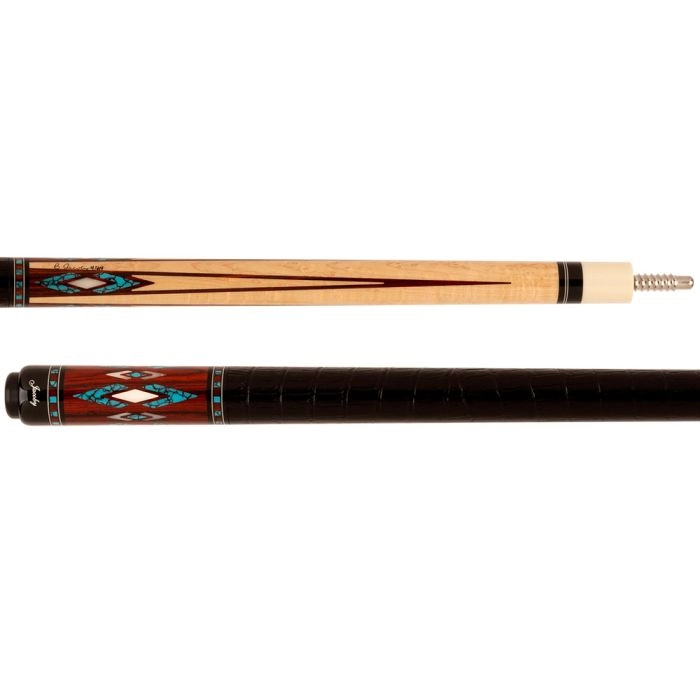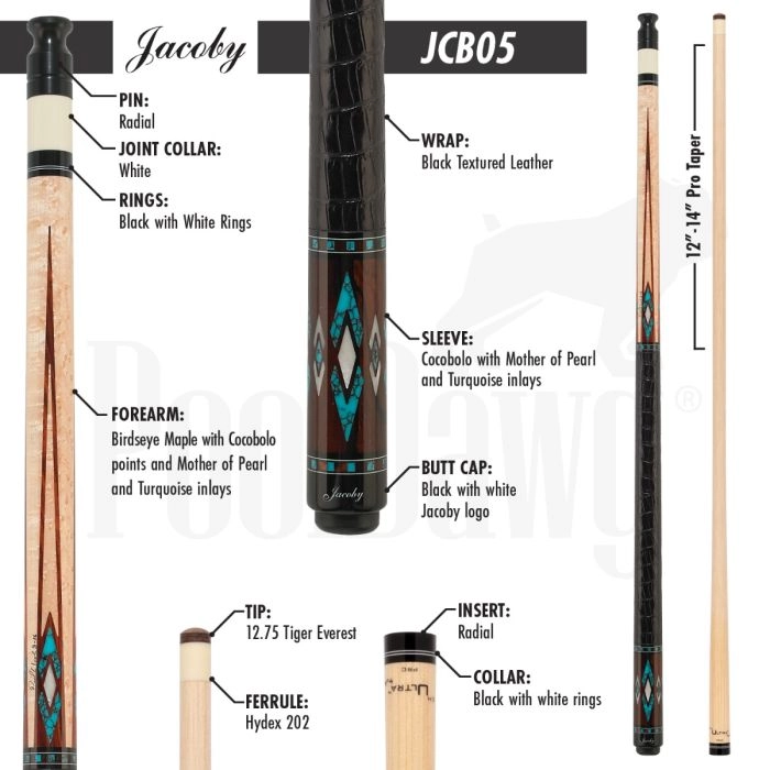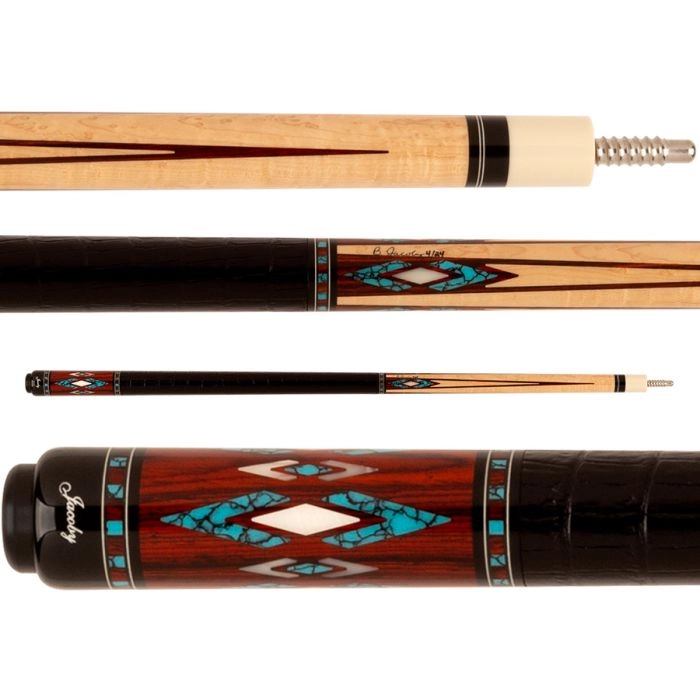 The Jacoby HB4T features a Birdseye Maple forearm with Cocobolo points and Turquoise and Mother of Pearl inlays. The wrap is a black textured Leather. The Mother of Pearl and Turquoise inlays are also featured in the butt sleeve. This cue features a Jacoby signature along with the date of completion and may or may not include free joint protectors.