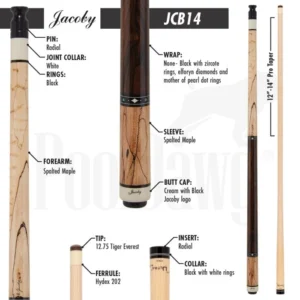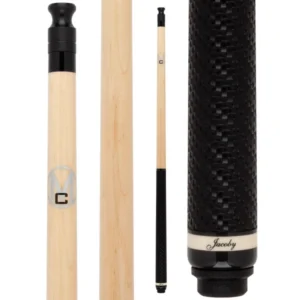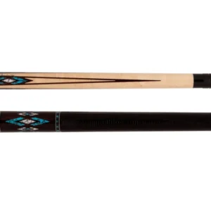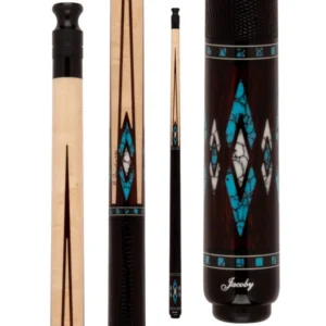 The Jacoby HB7 V2 showcases a stunning combination of exotic Tiger Stripe Maple and richly patterned Bocote. The forearm and sleeve highlight the flowing, tiger-like grain of the maple, while the Bocote wrap section provides a bold, contrasting zebra-like texture. The cue is meticulously detailed with thirty-six White Buffalo Turquoise index stitches, adding a vibrant touch. Eight Maple points and eight black inlaid spears offer a classic aesthetic, while the White Buffalo Turquoise spears create an unique element. This beautifully crafted cue is equipped a 12.75 MM Ultra Pro Shaft, ensuring exceptional performance.