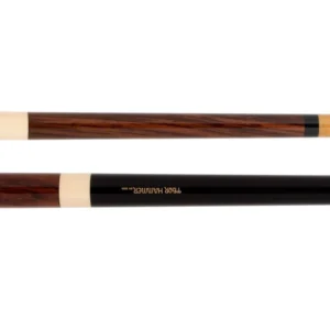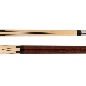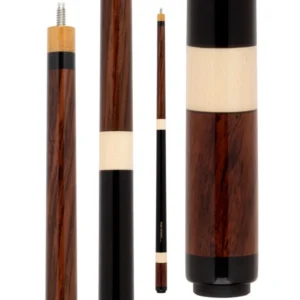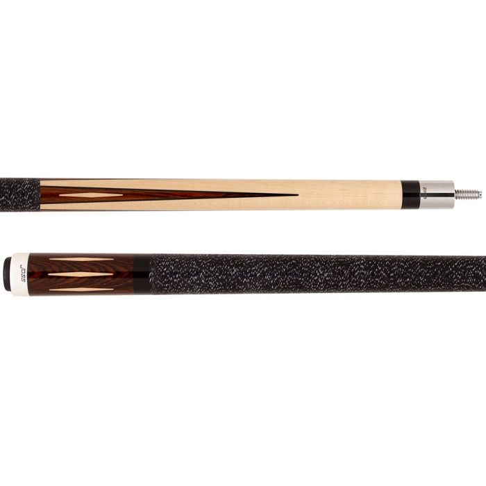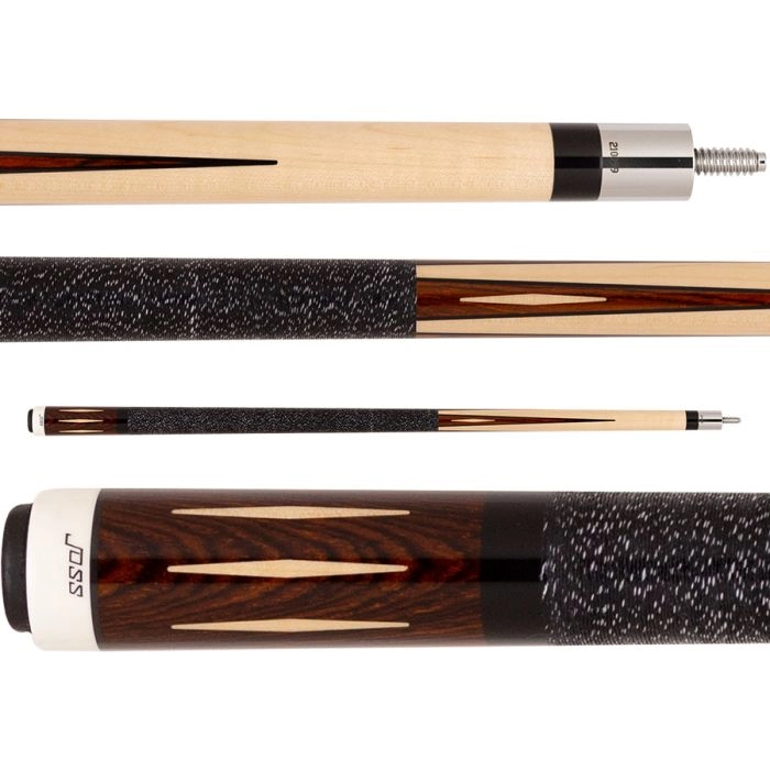 Opposites attract! Opposing woods used on the forearm and sleeve of the Joss JOS04 pool cue creates an attractive look and feel. On the sleeve, rich cocobolo wood is decorated with white holly diamond inlays, while on the forearm natural Figured Flame Birch features four cocobolo points with ebony veneers and white holly diamond inlays. The black and white Irish linen wrap connects the two sections. By utilizing a shaft with a shorter taper and thicker shaft as well as a stainless steel joint, this cue offers a stiff hit.