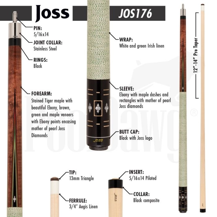 Joss is synonymous with quality and performance. They’ve been around for decades, and cues like the JOS176 is why. This cue features stained tiger maple in the forearm, intricate multi-color points, and a very recognizable inlaid boxes and diamonds design in the butt. This cue also comes standard with a buttery soft Irish linen wrap to improve performance.