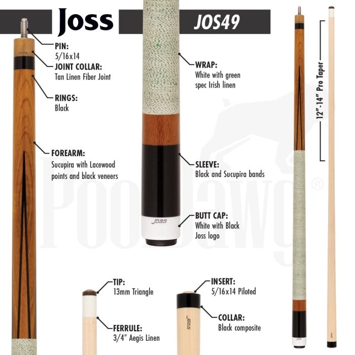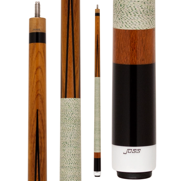 Moving down the length of the cue, you are presented with a reversed white and green Irish linen wrap, more Brazilian hardwood and a ring of jet black maple to finish it off. From a playability perspective, the JOS49 features the same moderately stiff feel that is standard with all Joss pool cues.