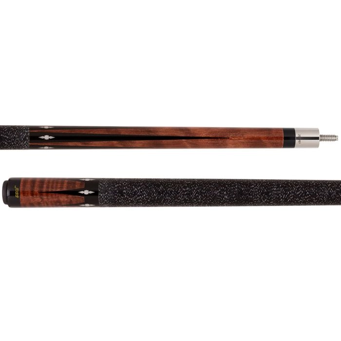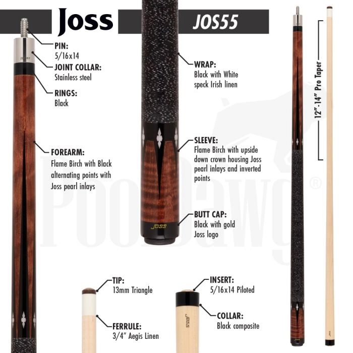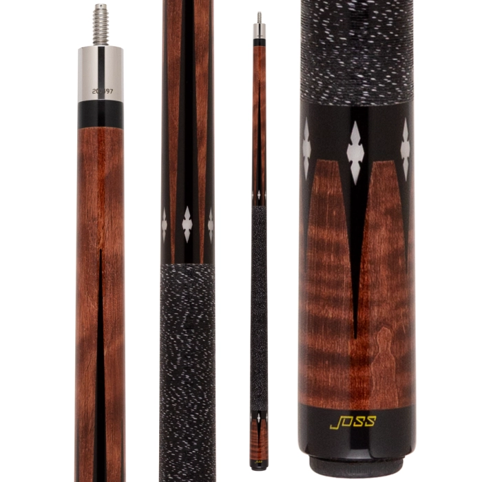 Joss. Craftsmanship. Dedication to detail. Hardwork. Time and effort. All of those things goes into the culmination of a Joss cue. This new Joss cue, the JOS55, takes inlaid points and diamonds to a whole new level. With a Flame Birch forearm that displays solid black alternating points, you can really see the Joss pearl inlays stand out. Something about pearl against black just looks classy and stylish! As with most Joss cues, the traditional black with white speck Irish linen wrap is present on this cue. The butt sleeve has inverted black points that reach down towards the bumper of the cue that come from an almost upside down crown collar right at the base of the wrap. Each point on the butt sleeve features Joss pearl inlays.