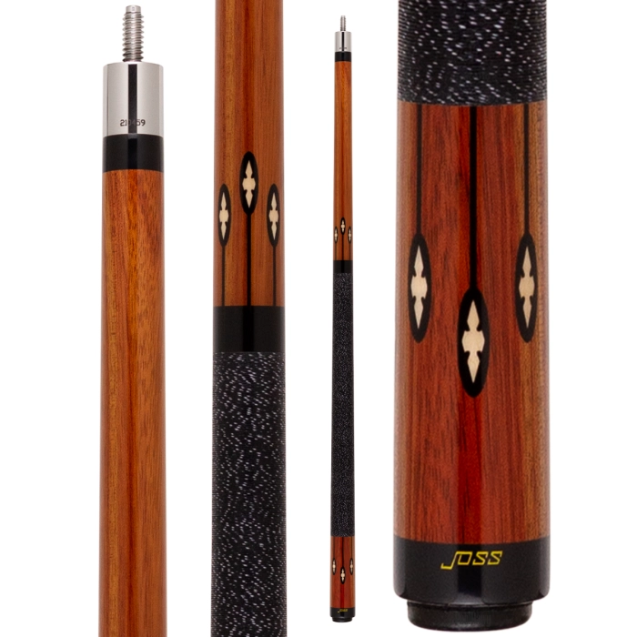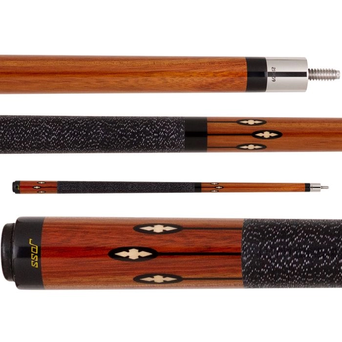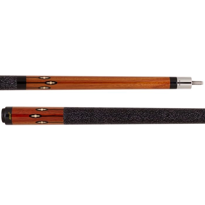 Notched diamond-shaped inlays of holly add a hint of brightness to the deep, rich bloodwood and ebony forearm and sleeve of the Joss JOS61 pool stick. A black Irish linen wrap with white specks complements the design and adds a non-slip grip.