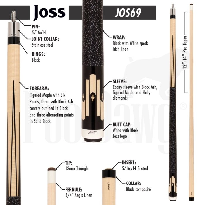 How it plays: Joss cues hit stiff due to the stainless steel joint, shorter taper and thicker shaft diameter. Joss has been preserving the traditional look and values of old-time cue making since 1968.