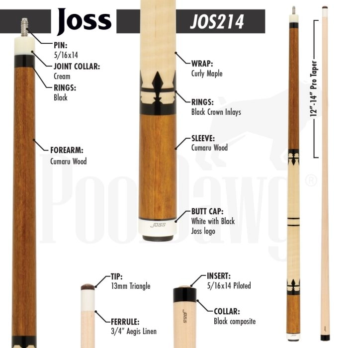 Introducing the mesmerizing new Joss cue, featuring the rich beauty of Cumaru Wood on both the forearm and sleeve. The Black Crown Inlays add a touch of regal charm to the cue, creating a visual masterpiece. The Curly Maple with Black Rings in place of a traditional wrap enhances the cue’s sleek and contemporary aesthetic. Equipped with a 13mm Tweeten Triangle Tip, this cue delivers exceptional performance and accuracy. Elevate your game and showcase your style with the exquisite craftsmanship of the Joss cue.