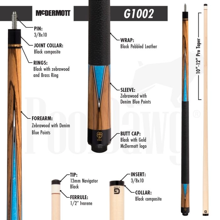 The McDermott G Series are some of the best cues in the industry, and the McDermott G1002 Pool Cue is no exception to this. Performance is unmatched with the Carbon Fiber Core paired with the Navigator Black Tip increases the stability and consistency of the cue. Combined with the stylish design of the Zebrawood and Denim blue points, this cue showcases some of the top craftsmanship from McDermott.