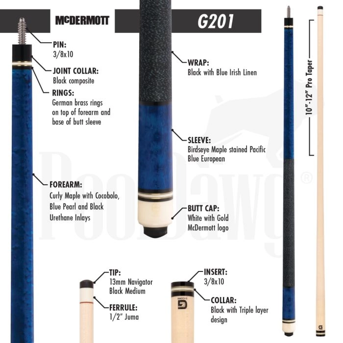 You definitely won’t be feeling the blue’s with the G201 pool cue. This pool cue features McDermott’s G-Core shaft which uses CT technology and three-layer construction to enhance hit integrity, minimize vibration and allow you to maintain efficiency and accuracy. Birdseye Maple stained Pacific Blue with an organic, European stain, German brass rings and an Irish linen wrap deliver sophisticated design.