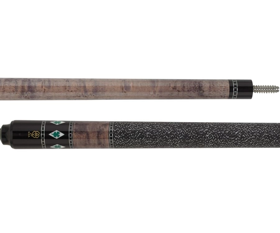 Beauty and class come to mind with the SL3 pool cue from McDermott’s Select Series line of cues. This McDermott SL3 features a light grey stain on the Birdseye maple in the forearm and butt sleeve and accented by black with silver dashed index rings. The i3 Intimidator shaft will give you incredible performance thanks to the 11.75mm diameter and the Blue Impact Navigator tip set in a super soft density. The ‘lucky’ part of the cue is the 6 green urethane clover inlays surrounded by the white urethane diamonds.