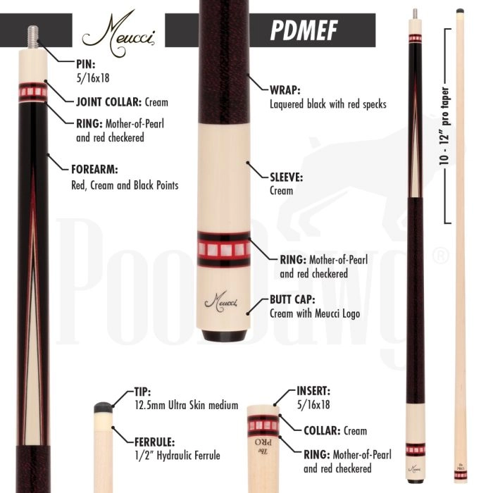 This Pooldawg exclusive Meucci pool cue is a masterpiece of craftsmanship and innovation. Meticulously crafted, this cue showcases the renowned quality and precision engineering synonymous with the Meucci brand. Each detail, from the sleek design to the flawless finish, exudes sophistication and style. Constructed with premium materials such as Mother of Pearl inlays, this cue offers exceptional performance and durability, ensuring it withstands the rigors of intense gameplay. The carefully selected maple wood provides a solid and responsive feel, while the state-of-the-art technology incorporated into the cue enhances accuracy and control with every shot. Experience the thrill of precision and power with the Pooldawg exclusive Meucci pool cue. Whether you’re competing in tournaments or enjoying a casual game with friends, this cue is sure to impress with its performance.