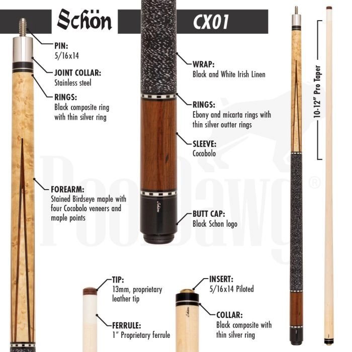 If you’re looking for a high quality cue without a lot of fuss, the Schon CX01 custom pool stick is the perfect choice. Backed by Schon’s proprietary manufacturing techniques and incorporating fine woods and proprietary components, this cue definitely lives up to Schon’s tradition of excellence.
