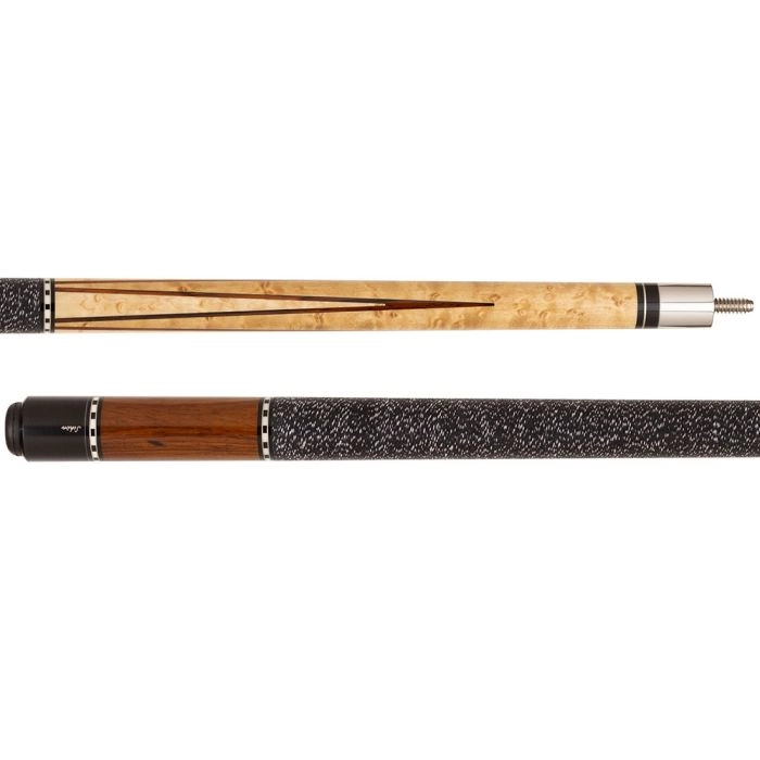 A stiff hit is generated by the piloted stainless steel joint and shorter shaft taper, which is made of hardrock maple. Moving up the cue, blonde Birdseye Maple on the forearm is decorated with beautiful white stained maple points and Cocobolo veneer inlays. The black Irish linen wrap with white specks leads to the sleeve, which is gorgeous cocobola wood. Three Balabushka style rings of ebony, Micarta and nickel silver complete the package.