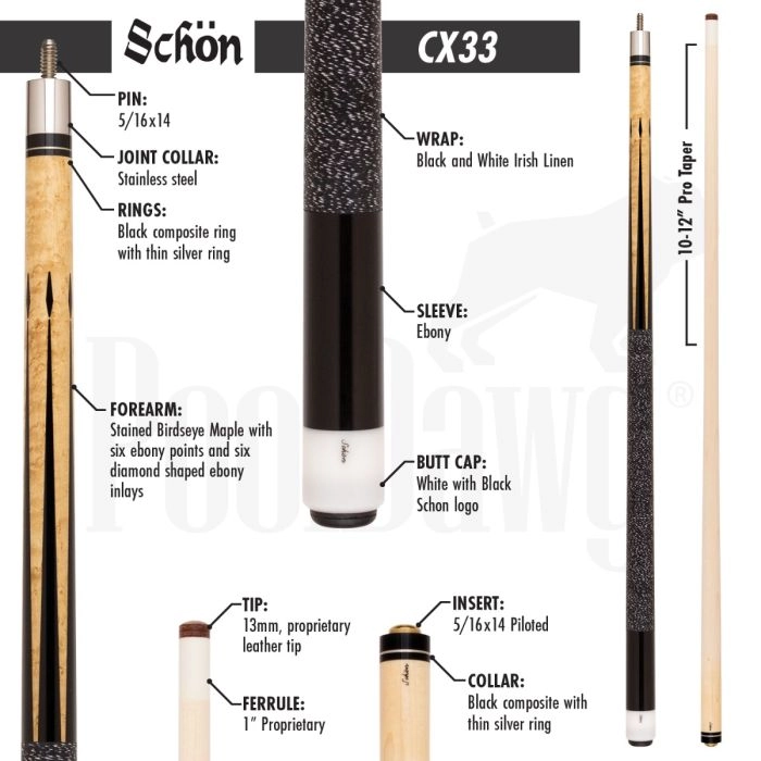 While its design may be understated, you can be assured that the craftsmanship behind the Schon CX33 cue is anything but simple. Beautiful Birdseye Maple on the forearm features sleek ebony inlay points topped with diamond shapes. The black Irish linen wrap with white specks leads to a lustrous ebony sleeve.
