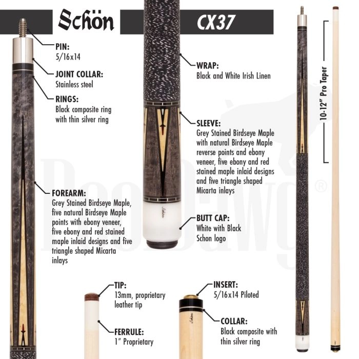 The Schon CX37 custom cue incorporates a piloted stainless steel joint and shorter shaft taper to offer a stiff hit for the serious player who appreciates a high performing, well crafted pool stick. Of course, well crafted is an understatement, as this cue is backed by proprietary manufacturing techniques and fine detail.